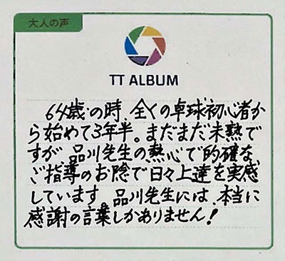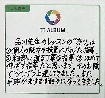 品川先生のレッスンの売りは①個人の能力や技量に応じた指導②細部に渡る丁寧な指導③ほめて伸ばす指導だと思います。そのお陰で少しずつ上達してきました。また、卓球がますます好きになってきました。