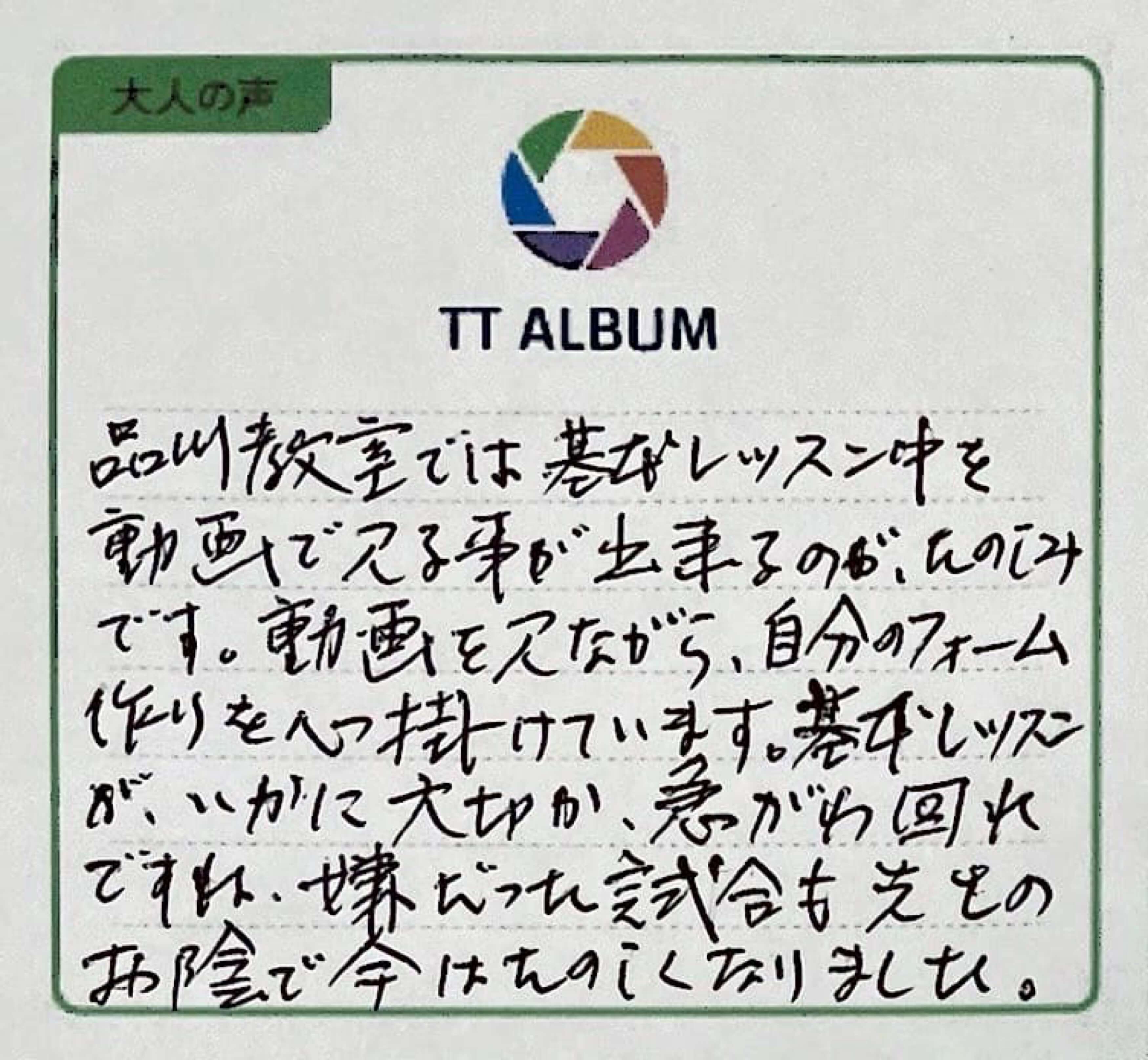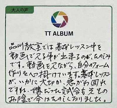 品川教室では、レッスン中を動画で見ることができるのがたのしみです。動画を見ながら、自分のフォームづくりを心がけています。基本レッスンがいかに大切か、急がば回れですね。嫌だった試合も先生のお陰で今はたのしくなりました。