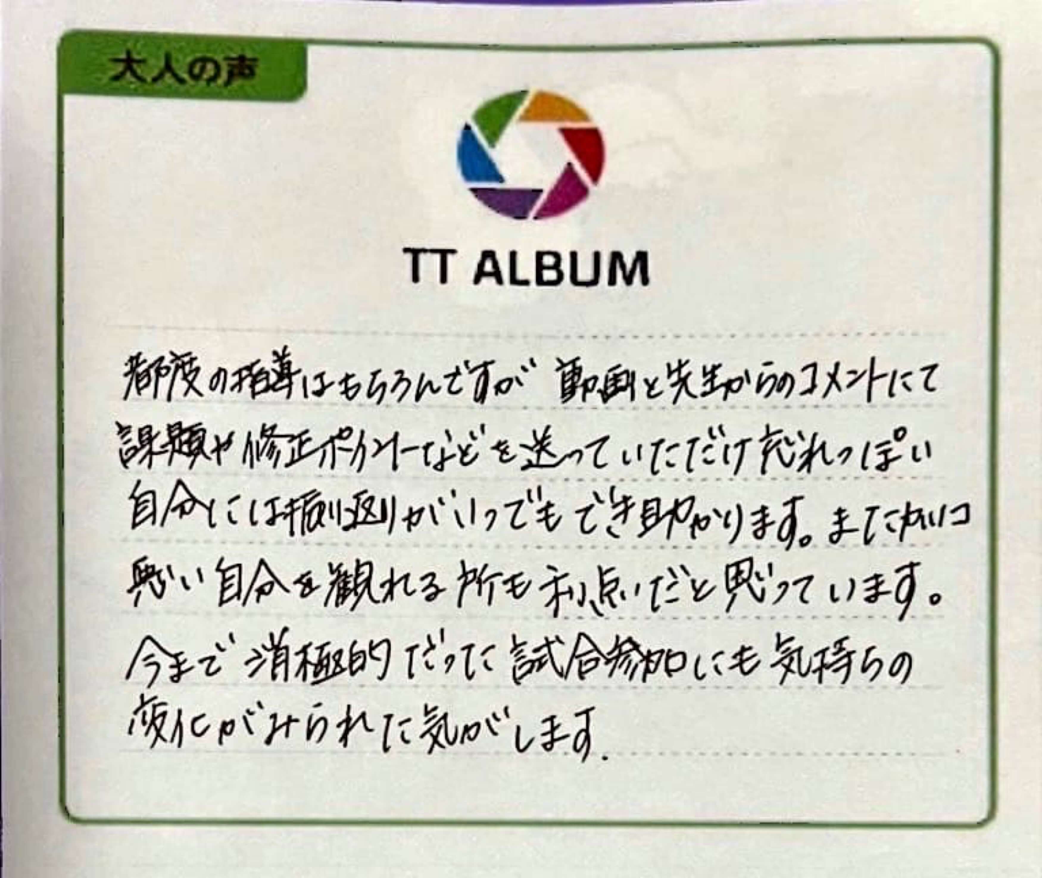 都度の指導はもちろんですが動画と先生からのコメントにて課題や修正ポイントなどを送っていただけ忘れっぽい自分には振り返りがいつでもでき助かります。またカッコ悪い自分を観れる所も利点だと思っています。今まで消極的だった試合参加にも気持ちの変化が見られた気がします。