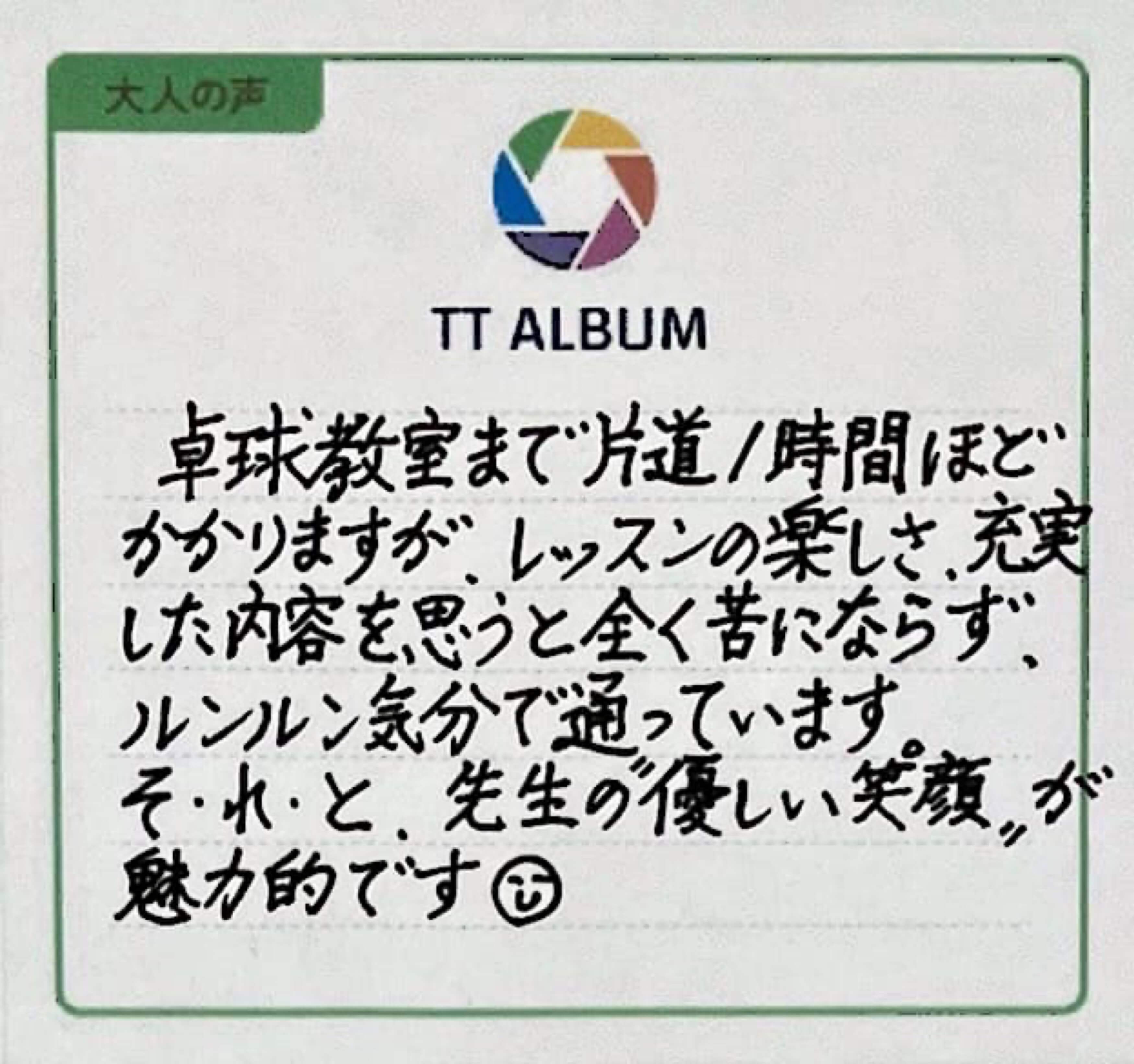 卓球教室まで片道1時間ほどかかりますが、レッスンの楽しさ、充実した内容を思うと全く苦にならず、ルンルン気分で通っています。それと、先生の優しい笑顔が魅力的です。