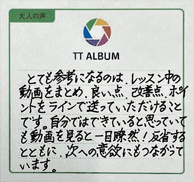 とても参考になるのは、レッスン中の動画をまとめ、良い点、改善点、ポイントをラインで送っていただけることです。自分ではできていると思っていても動画を見ると一目瞭然!反省するとともに、次への意欲にも繋がっています。