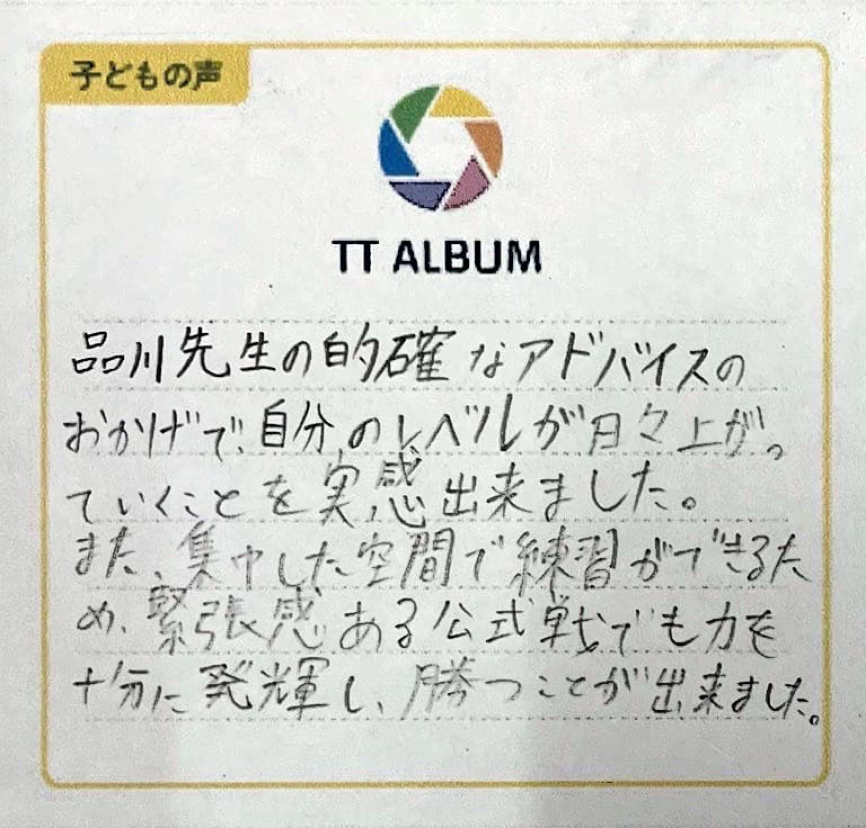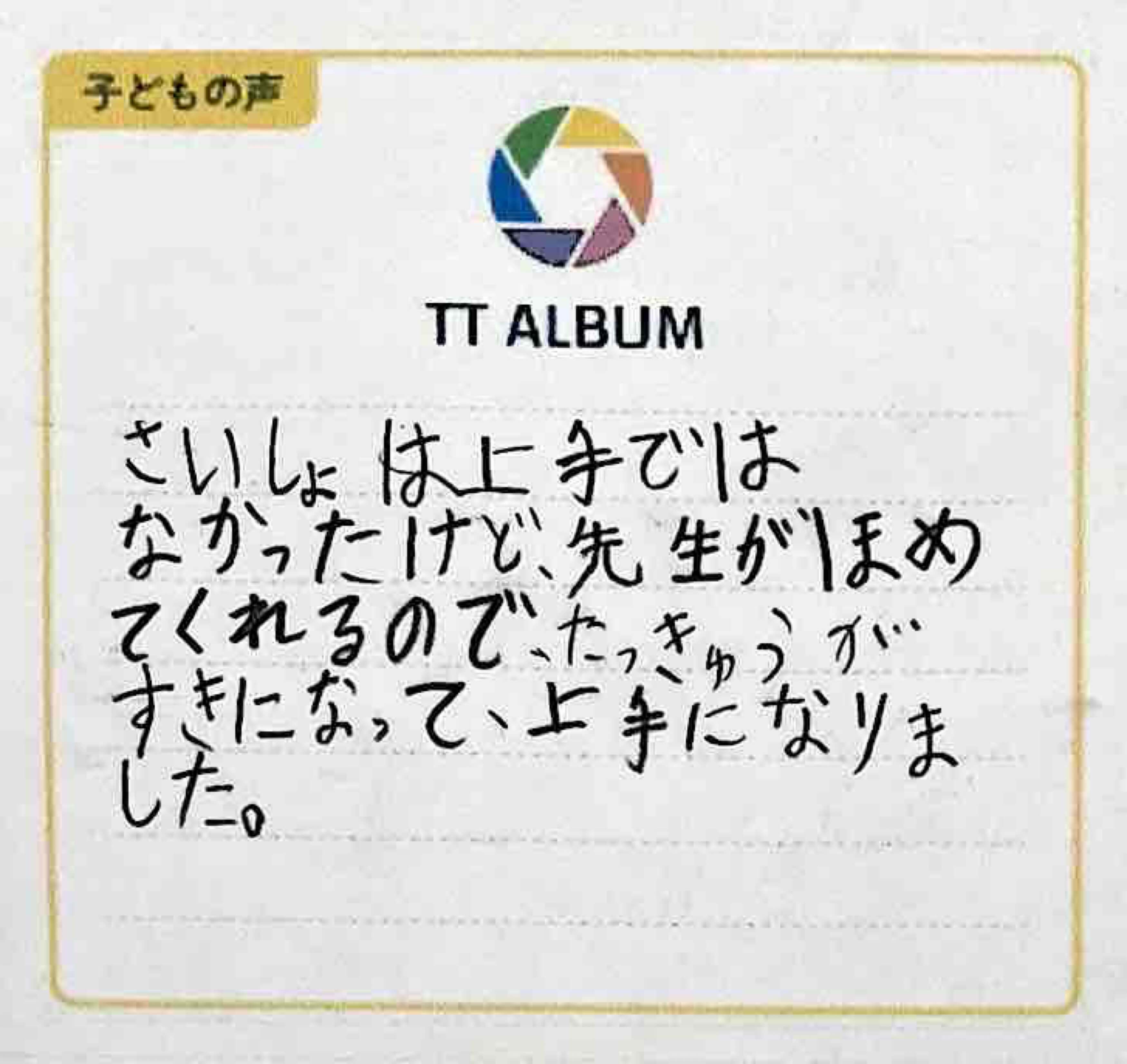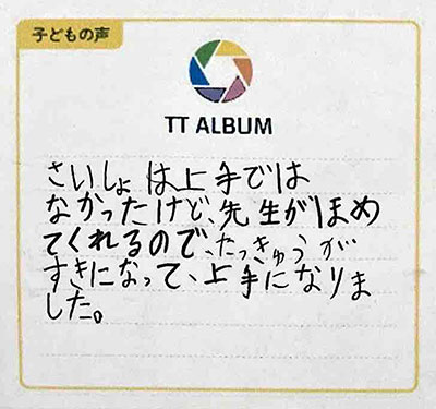 さいしょは上手ではなかったけど、先生がほめてくれるので、たっきゅうがすきになって上手になりました。