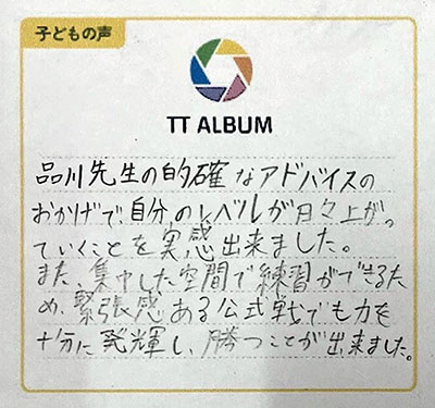 品川先生の的確なアドバイスのおかげで、自分のレベルが日々上がっていくことを実感できました。また、集中した空間で練習ができるため、緊張感ある公式戦でも力を十分に発揮し、勝つことができました。