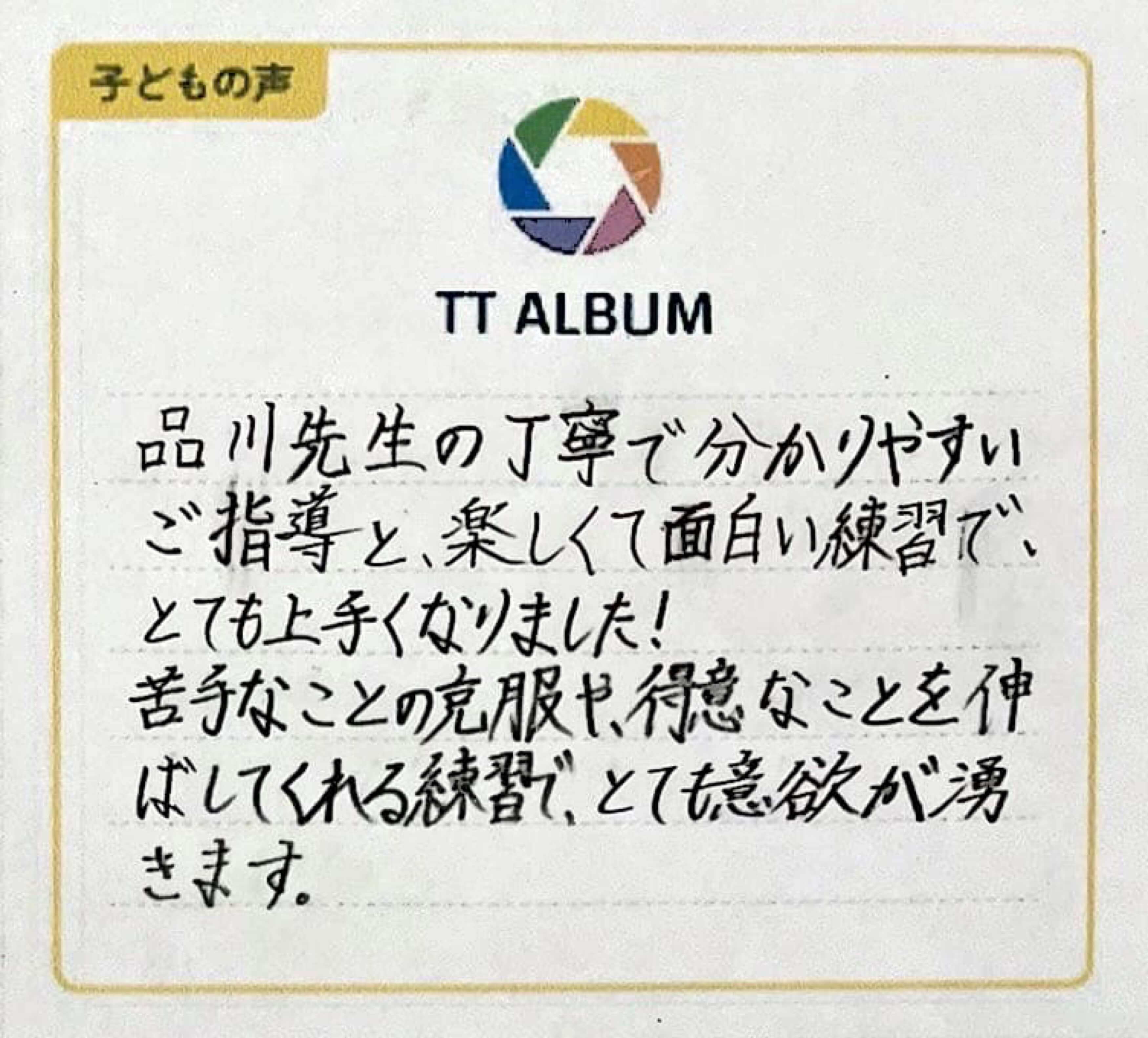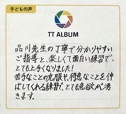 品川先生の丁寧で分かりやすいご指導と、楽しくて面白い練習でとても上手くなりました!苦手なことの克服や、得意なことを伸ばしてくれる練習で、とても意欲が湧きます。
